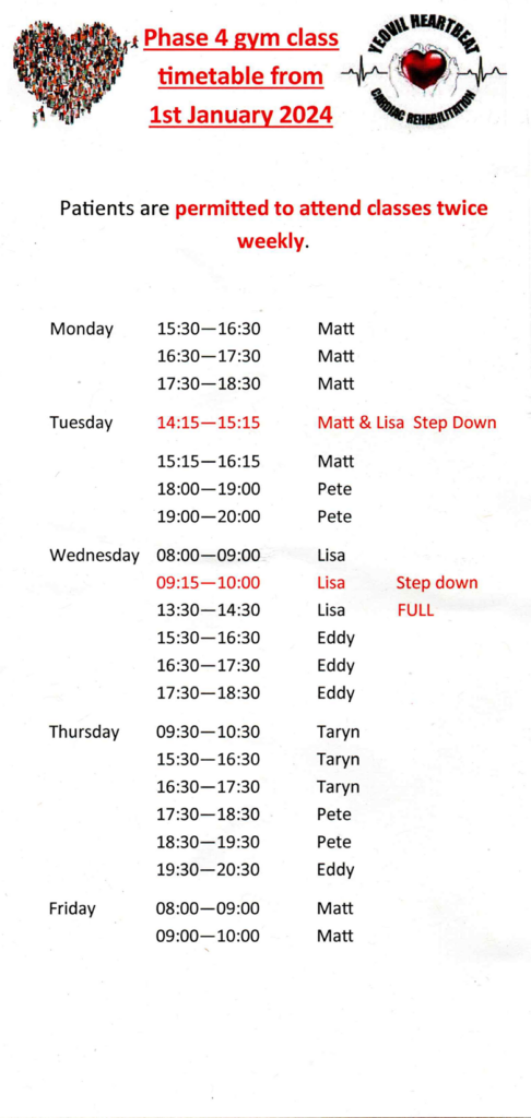 “Phase 4” cardiac rehabilitation is voluntary and can be lifelong but some hospitals refer patients to local gyms or for home exercise after discharge. Yeovil Heartbeat provides dedicated “Phase 4” exercise classes within Yeovil Hospital in a specialised gym, run by our specially qualified Exercise Instructors and can be started after successful completion of “Phase 3”. We see about 300 patients a year participate in “Phase 4” sessions. A small fee is charged to contribute to the costs of running the “Phase 4” program.